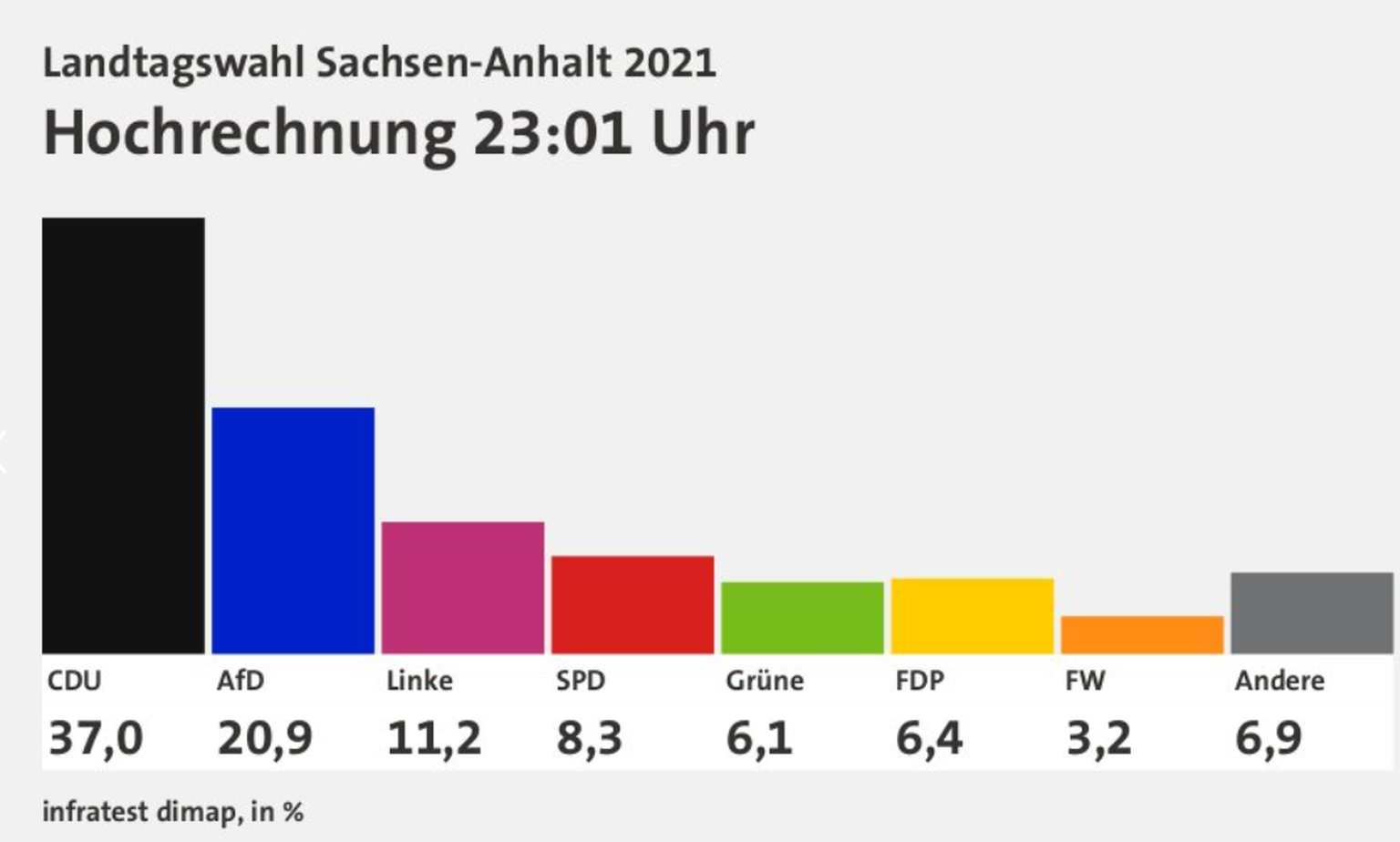 Die afd bleibt nach der ersten hochrechnung von ard und zdf zweitstärkste kraft. Die afd schnitt schwächer ab als nach letzten umfragen erwartet. Nach hochrechnungen von ard und zdf verbesserte sich die partei von ministerpräsident reiner haseloff am sonntag auf 36,0 bis. Rund 1,8 millionen wahlberechtigte sind aufgerufen, ihre stimme abzugeben. Nach ersten hochrechnungen kommt sie auf rund 36 prozent, die afd auf knapp 23 prozent.